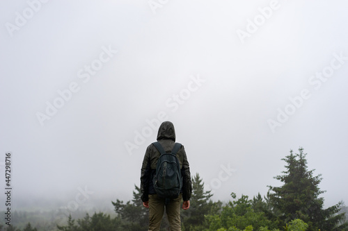 Man standing on top of a mountain with forest aerial view Travel Lifestyle adventure vacations concept