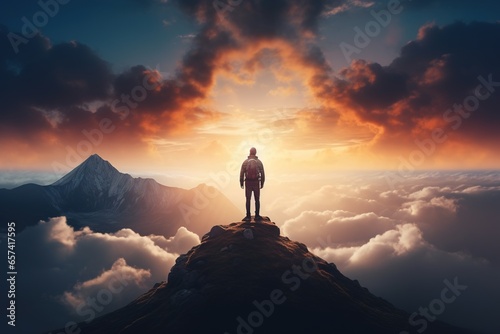mountain, man, person, sky, travel, peak, rock, landscape, top, hike, nature, sunset, cliff, success, male, extreme, adventure, young, freedom, standing, view, high, blue, achievement, hiker, sunrise, climb, silhouette, sunlight, caucasian, activity, trekking, stone, backpack, concept, adult, hill, holiday maker, sun, climber, cloud, altitude, morning, summit, business, edge, 1, leisure