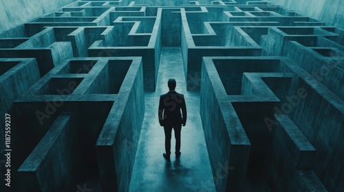 man, businessman, person, individual, labyrinth, labyrinth, concrete, wall, pathway, path, choice, decision, challenge, problem, solution, complex, difficult, intricate, puzzle, mystery, confusion, uncertainty, destination, journey, exploration, adventure, risk, opportunity, success, bankruptcy, strategy, planning, thinking, contemplating, future, direction, goal, ambition, perspective, view, obstacle, barrier, way, forward, progress, resolution
