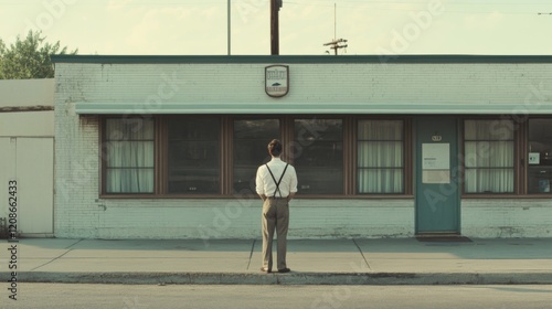 man, building, street, vintage, retro, architecture, urban, exterior, facades, window, door, sidewalk, pavement, summer, day, sunlight, light, shadow, calm, quiet, peaceful, alone, solitary, thoughtful, pensive, contemplative, person, male, adult, standing, back, view, perspective, scene, landscape, town, city, road, empty, simple, plain, design, style, aesthetic, image, photo, picture