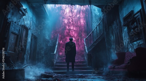 man, doorway, luxury home, aethereal, dilapidated, stair, mystery, surreal, vision, light, fantasy, creepy, horror, abandoned, house, staircase, building, interior, dark, visionary, art, skittish, colours, imagination, atmosphere, blue, pink, foggy, hallway, silhouette, dream, spiritual, enigmatic, perspective, vertical, empty, dust, shadow, old, vintage, haunted, journey, unknown