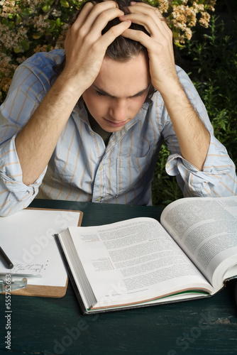outdoors, daytime, brunette, caucasian, man, life, human, alone, study, concern, individual, pressure, confused, image, casual attire, review, stress, frustration, college, student, person, pupil, living, picture, homework, 1, photograph, research, humanity, studying, secondary, textbook, long-haired, eye contact, black hair, white, exterior, adult, live, read, young, male, looking down, color image