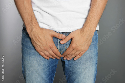Man suffering from genital herpes on grey background, closeup