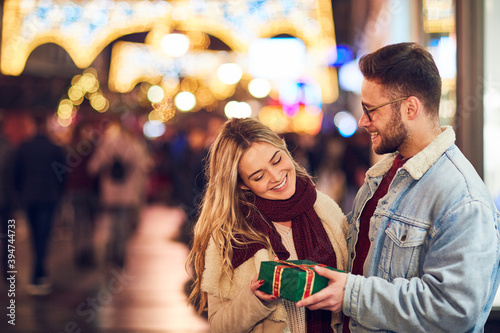 couple, gift, street, city, night, christmas, hipster, woman, man, love, human relationships, box, smile, happy, curly, beard, winter, foulard, sweater, kiss, valentine, february 14, boyfriend, cheerful, male, joy, friends, giving, dating, present, holiday, girl, female, people, romantic, surprise, celebration, together, caucasian, smiling, new year, girlfriend, celebrate, birthday, anniversary, blond, eyeglass