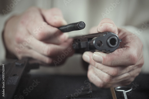 weapon, weapon, steel, attack, defense, assassin, defender, self protection, fight, martial art, danger, dangerous, powerful, metal, iron, hand, style, holding, grip, finger, shooting, ballistic, secret, agent, service, locking, isolated, background, gun, handgun, handgun, studio, industry, care, cleaning, assembling, checking, safety, mag, death, deadly, gun control