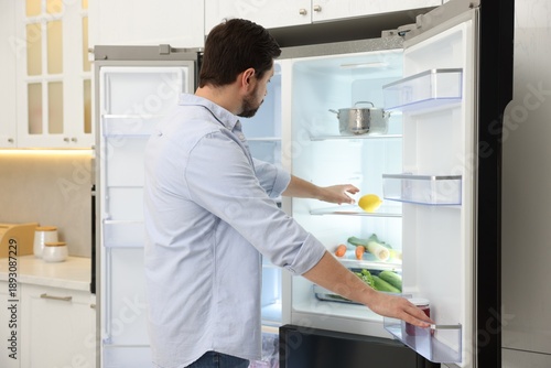 Man taking lemon out of refrigerator in kitchen