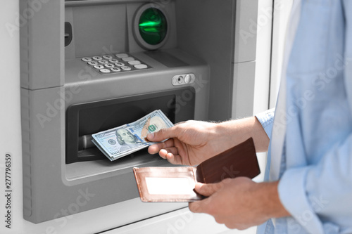 Man taking money from cash machine outdoors, closeup