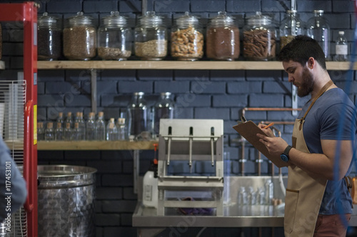 Man taking notes on clipboard in distillery