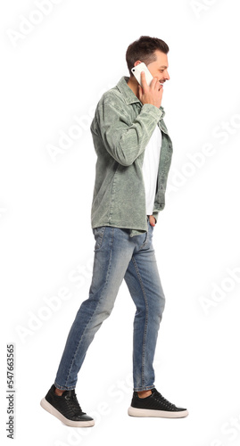accessory, adult, apparel, background, casual attire, caucasian, clothes, clothing, colours, design, elegant, fashion, fashionable, full, garment, isolated, length, lifestyle, male, man, mature, model, modern, move, moving, outfit, person, phone, portrait, posing, profile, single, stepping, studio, style, stylish, talking, trend, trendy, walk, walking, wear, white