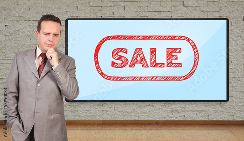 businessman, idea, concept, sale, business, promotion, signs, marketing, merchandise, offer, retail, symbol, discount, price, success, workshop, television, seminar, office, wall, room, interior, floor, wooden, communication, digital, display, electronic, information, monitor, panel, plasma, screen, technology, television, led, flat, wide, man, suit, human, manager, male, elegant, photogenic, thinking