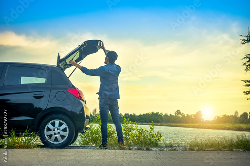 Man traveler standing at hatchback car and car parked on road Sky sunlight background
