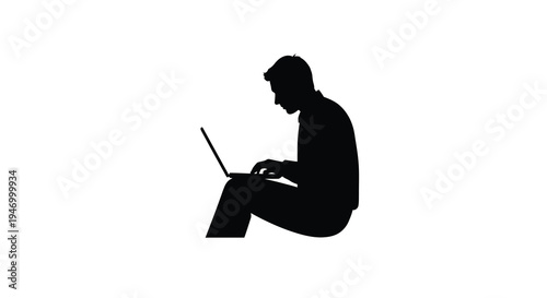 technology, digital, computer, laptop, work, office, business, man, male, person, sitting, indoor, isolated, contrast, black, white, minimalist, modern, profile, side, view, typing, keyboard, screen, device, communication, silhouette, graphic, design, image, illustration, simplicity