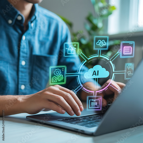 Man using AI cloud computing on laptop, modern technology, data analysis, digital transformation