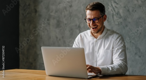 man, laptop, desk, office, wooden, smiling, minimalist, male, goggles, shirt, white, working, typing, remote, professional, business, modern, textured, concrete, wall, interior, casual attire, happy, entrepreneur, freelance, technology, computer, screen, communication, meeting, online, productivity, sharpened, natural, light, copy space, copy, space, workspace, table, clean, informal, portrait, confident