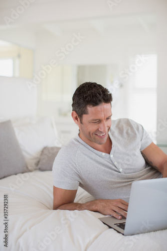 man, use, laptop, bed, access, adult, alone, bedchamber, brunette, communication, convenient, copy space, day, domestic, electronic mail, enjoy, entertainment, front view, happy, indoor, cyberspace, lay, lean, leisure, lifestyle, mature, media, mobility, 1, online, people, person, read, smile, social, technology, view, watch, wireless