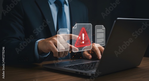 man, laptop, document, icon, red, warning, signs, screen, interface, overlay, typing, business, suit, attaching, technology, computer, alert, error, problem, caution, attention, exclamation, mark, datum, protection, privacy, security, cyberspace, network, digital, online, information, system, risk, threat, vulnerability, attack, hacker, virus, fraud, scam, phishing, identity, thieving, breach, confidentiality, with