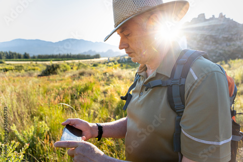 explorer, smartphone, hiking, lush, landscape, sunlight, adventure, technology, backpack, hat, mobile phone, vacation, traveler, grass, hiker, nature, trekking, wanderlust, global positioning system, sunbeam, trip, retirement, wireless, journey, countryside, direction, leisure, recreation, get-away, guidance, casual attire, land, carefree, lifestyle, tour tourism, copy space, plant, backlit, holiday maker, outdoors, sunset, 1, person, adult, male, mature, man, caucasian, horizontal