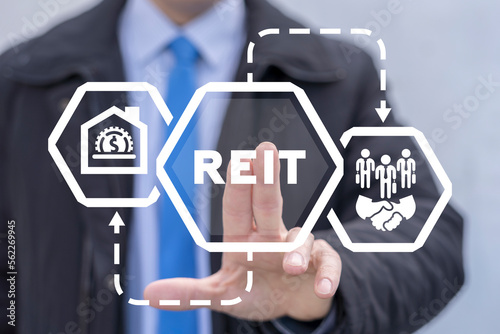 Man using virtual touchscreen presses abbreviation: REAL ESTATE. Real Estate Investment Trust REIT concept. Mutual Fund and investment, real estate, property, manager, broker, investor and return.