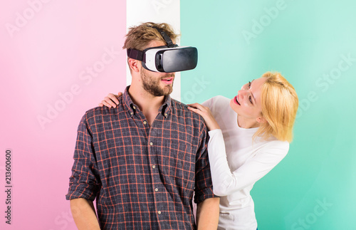 Man VR glasses enjoy video game. Girl happy he like her gift. Gift ideas for men. Make him happy gift him virtual reality glasses and let play games all day. Best gift ever. Man enjoy virtual reality