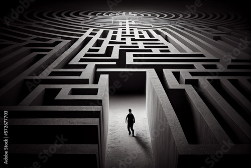 Man Walking Into Big Labyrinth. Finding Solution Concept. Generative AI