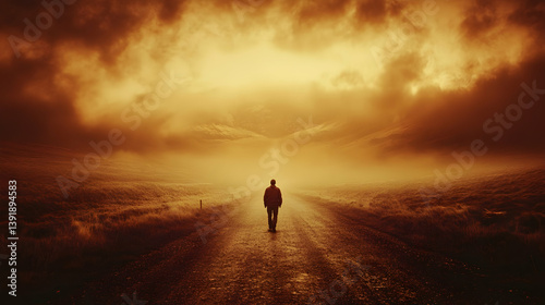 Man walking lonely road, fiery sky, hope