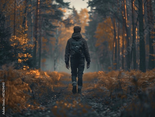 autumn, forest, man, walking, backpack, dusk, tree, leaf, gold, nature, outdoors, serene, peaceful, solitude, adventure, exploration, path, trail, wood, fall, foliage, landscape, journey, travel, scenic, wilderness, tranquil, environment, seasonal, hike, backlit, evening, twilight, atmospheric, moody, calm, wanderlust, natural, scenery, quiet, escape, trek