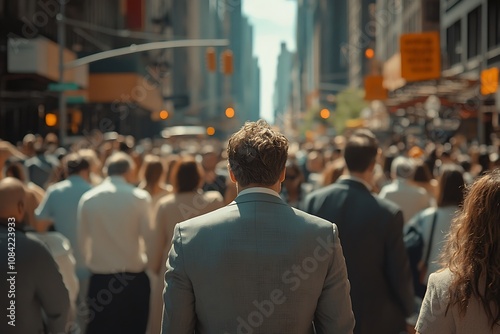 city, street, sidewalk, urban, building, crowd, people, man, walking, suit, back, head, anonymous, commute, traffic, city landscape, tied-up, urban life, metropolis, skyscraper, perspective, blur, depth of field, sharpened, sunlight, shadow, daytime, contemporary, business, office, city life, blurred background, midday, casual clothes, urban scene, public transportation, city lights, modern architecture