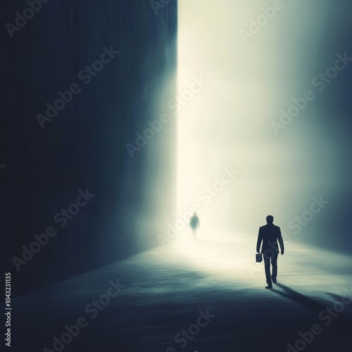 light, darkness, silhouette, shadow, mystery, hope, future, path, way, direction, journey, success, ambition, goal, dream, vision, businessman, briefcase, confident, determined, motivation, inspiration, abstract, surreal, surrealism, fantasy, conceptual, art, design, graphic, wallpaper