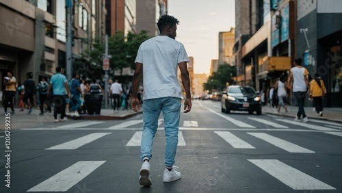 man, walking, street, city, urban, crosswalk, pedestrian, crossing, jean, shirt, white, blue, sneaker, shoe, asphalt, road, building, traffic, people, background, blurry, out, sharpened, daytime, sunlight, summer, day, light, shadow, scene, view, perspective, angle, back, away, going, moving, direction, journey, travel, life, modern, contemporary, style, fashion
