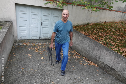 man, path, garden, rake, leaf, walking, concrete, entrance, tree, blue, shirt, pant, fall, season, gardening, activity, adult, sunlight, leisure, casual attire, step, nature, scenery, exercise, senior, male, tool, backyard, landscape, trail, home, work, community, fresh, air, neighbourhood, environment, landscaping