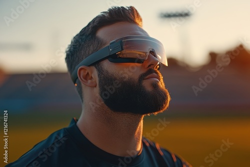 Man wearing advanced glasses at sunset on a sports field showcasing innovative technology
