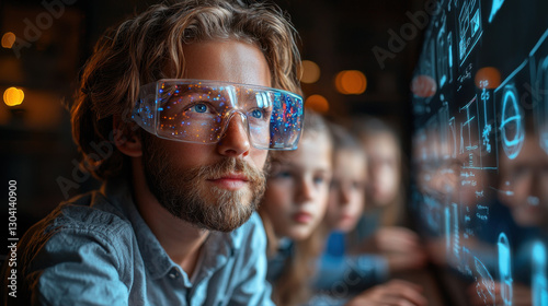 man wearing futuristic glasses is focused on digital screen displaying complex data, with children observing in background, suggesting learning environment