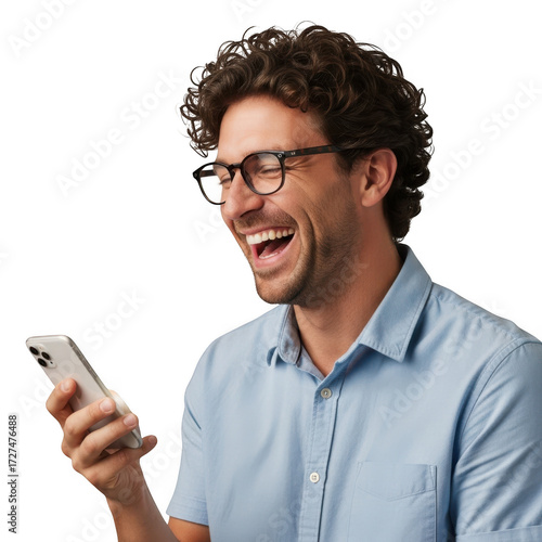 Man wearing glasses laughing while looking at his smartphone isolated on transparent background