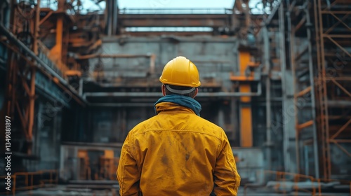 man, wearing, hard hat, looking, industrial, standing, backview, factory, daytime, steel, yellow, jacket, men at work, construction, building, outdoors, plant, structure, engineer, manufacturing, industry, uniform, male, design, equipment, protective, safety, occupation, architecture, site, mechanical, system, metal, inspecting, inspection, gear, development, job, employment