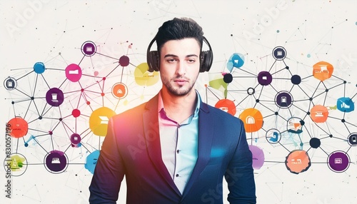man, earphones, listening, thinking, cyber, tech, technology, science, expression, art, abstract, business, businessman, person, concept, office, illustration, social, network, symbol, computer, design, cyberspace, bubble, success, cloud