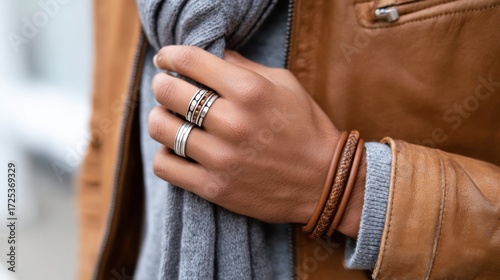 Man wearing leather bracelet and ring on finger, stylish fashion accessories, casual look