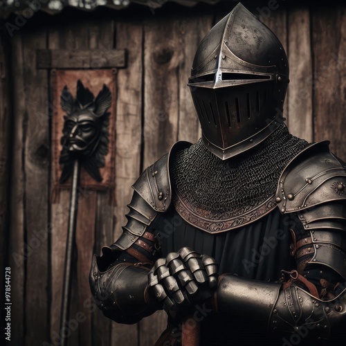 Man wearing Medieval Knights armor with heavy iron helmet