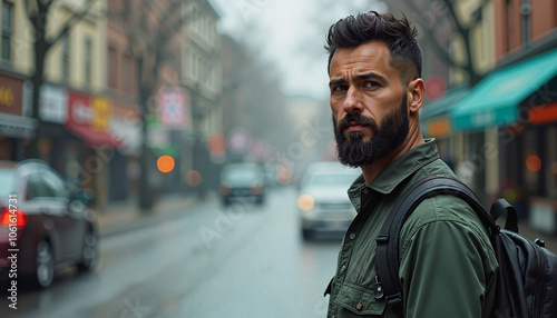 man, beard, backpack, rainy, street, urban, walking, city, fashion, casual attire, lifestyle, people, mood, expression, day, enjoyment, travel, modern, architecture, vehicle, environment, motion, thoughtful, scenery, contemporary, portrait, observation, concept, photo