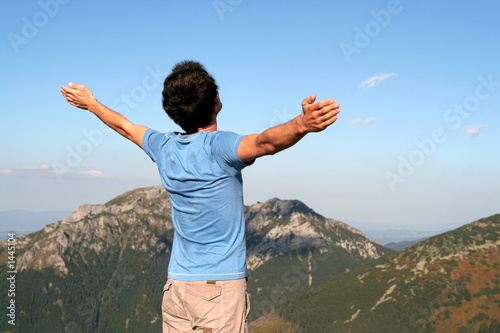 adult, people, 1, young, man, boy, leisure, carefree, freedom, summer, day, outdoors, summer, blue, sky, sun, sunny, happiness, happy, arm, outstretched, standing, independence, stretching, mountain, nature, landscape, tour tourism, climbing, back, back, health