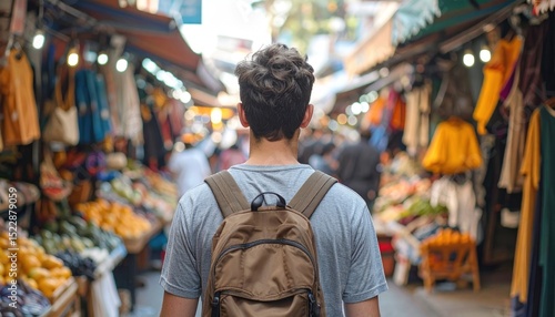 market, travel, backpack, man, crowd, walking, good, colourful, tour tourism, holiday maker, shopper, shopping, aisle, street, seller, ware, clothes, fruit, vegetable, produce, textile, summer, day, daytime, back, head, hair, lifestyle, adventure, explore, journey, vacation, retail, commercial, blurred, bokeh, sharpened, perspective, distance, anonymity, city, urban, anonymous, alone, solo, life events, culture, destination