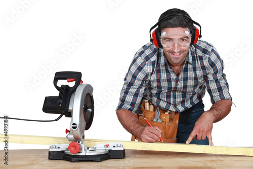 angle, arm, belt, carpenter, checking, craftsman, cut, cutting, elbow, finger, goggles, hand, handsaw, hearing, labor, level, timbering, male, man, marking, muffs, plank, protection, safety, saw, sawdust, sawhorse, slice, size, skilled, tool, trestle, trigger, wood, working, working man