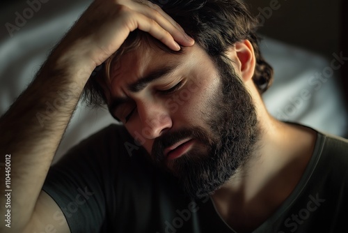 man, beard, cephalalgia, migraine, hangover, pain, suffering, young, morning, discomfort, indoor, portrait, closeup, facial expression, sharpened, serious, sad, grieved, sleepy, waking, bed, sleepy, sick, ill, unhappy, trouble, displeasure, style, photo, fashion, hair, health, disease, bad, day, recovery, healing, sorrowful, unwell, problem, troubled, feeling, suffer, frustrated