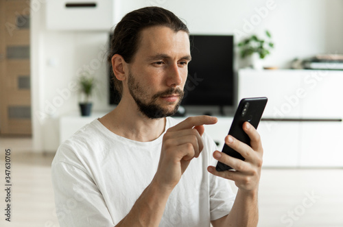 Man with beard, working at home and speaking with a friends or business partners or clients with a smartphone. Freelancer working from home.