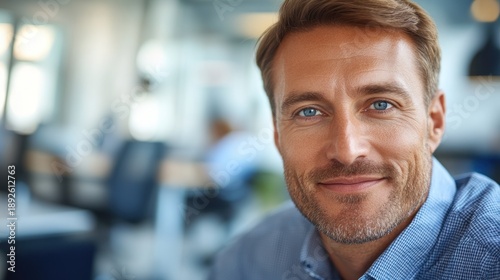 Man with blue eyes smiling in a modern office during a busy workday