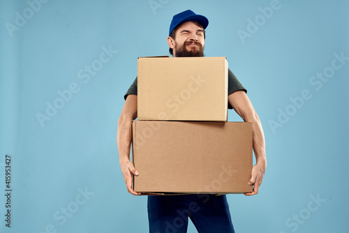man with boxes service delivery uniform working blue background