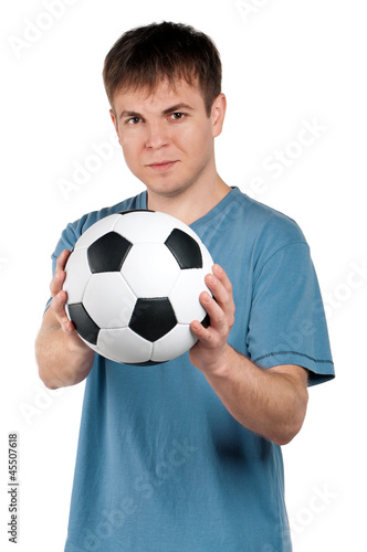 man, guy, male, ball, football, soccer, sport, game, football, people, portrait, white, leather, leisure, play, hobby, object, traditional, competition, isolated, cut-out, background, caucasian, european, championship, tournament, europa, match, hand, model, human, person, black, 1, alone, healthy, health, athletic, hold, beauty, half-length, adult, mid-adult, photogenic, casual attire, space, lifestyle, happy, smile, fun