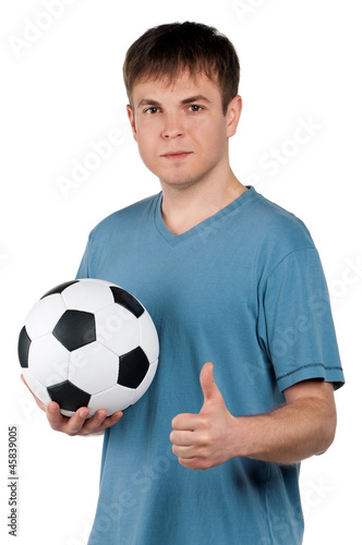 man, guy, male, ball, football, soccer, sport, game, football, people, portrait, white, leather, leisure, play, hobby, object, traditional, competition, isolated, cut-out, background, caucasian, european, championship, tournament, europa, match, hand, healthy, health, athletic, hold, beauty, half-length, adult, mid-adult, photogenic, lifestyle, gesture, signs, show, making, finger, thumb, winner, happy, smile, fun, joy