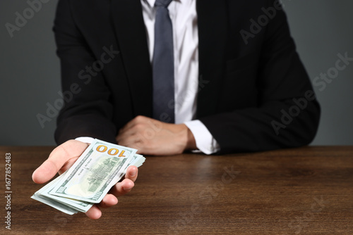 Man with dollar bills at wooden desk, closeup