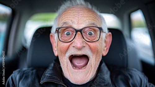 Man with glasses and a big smile on his face. He is in a car and he is excited