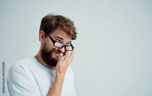 man with glasses in hand vision problems isolated background